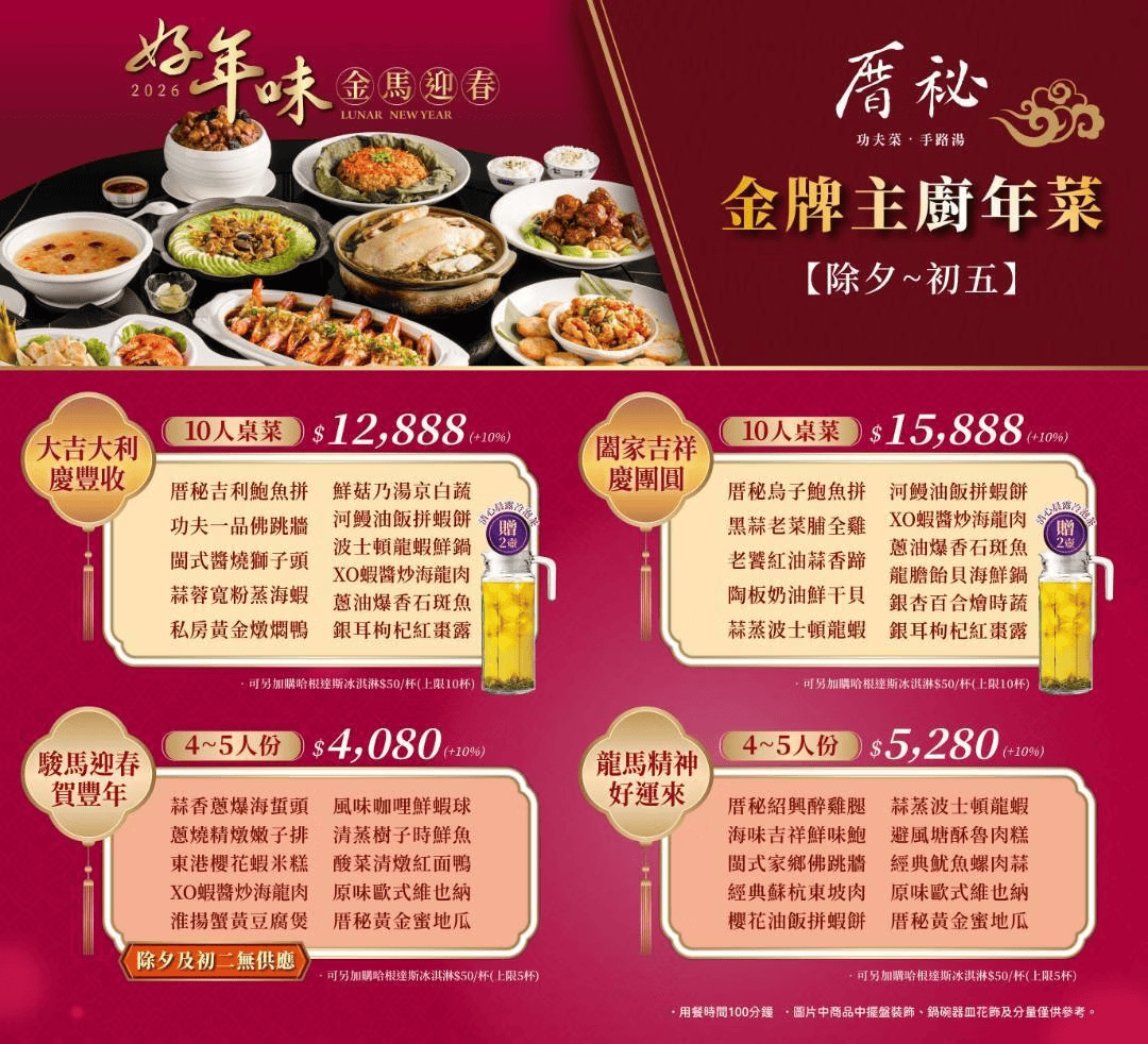 2026除夕桌菜圍爐單一價$17888(+10%),早鳥方案:2025/11/30前下訂,免10%服務費。